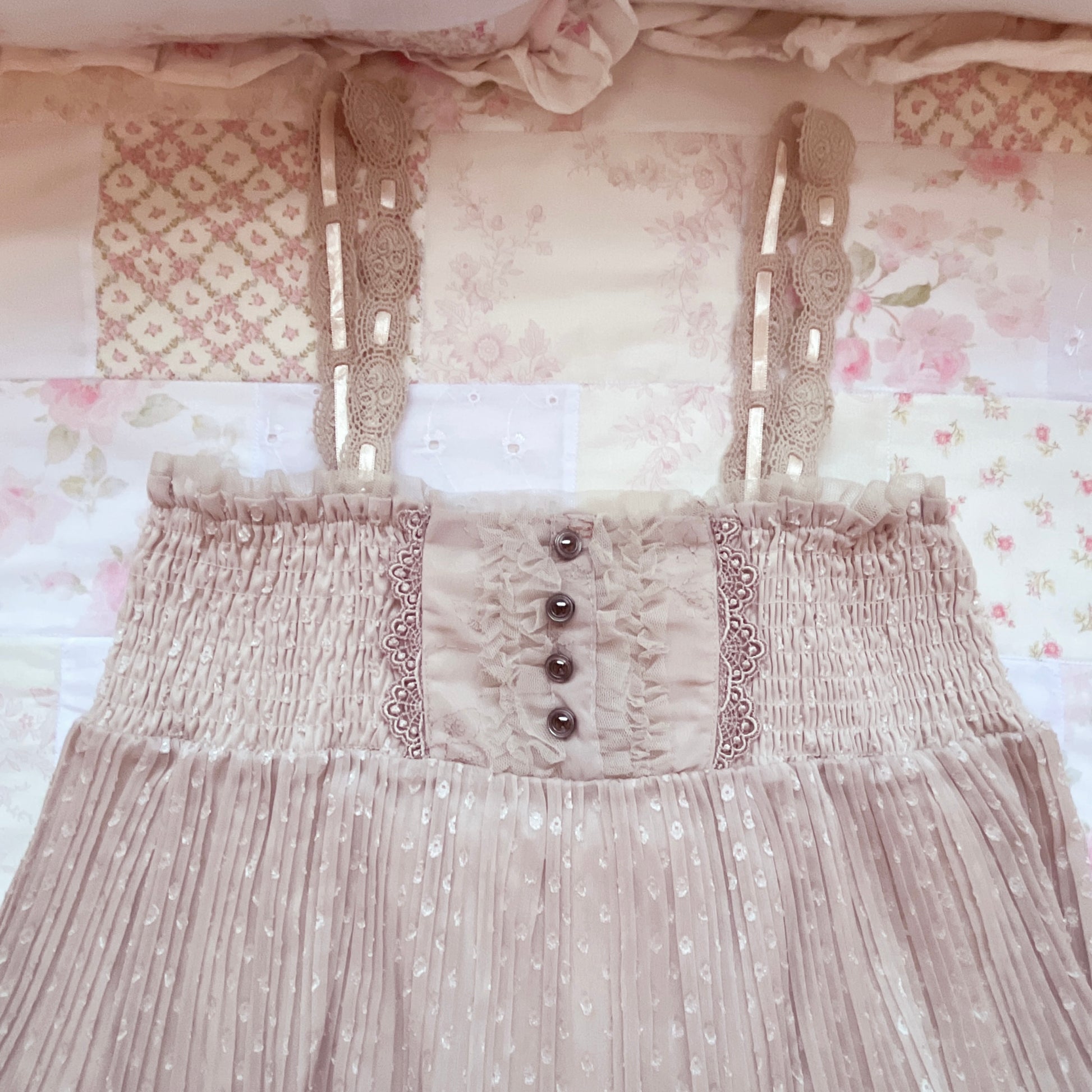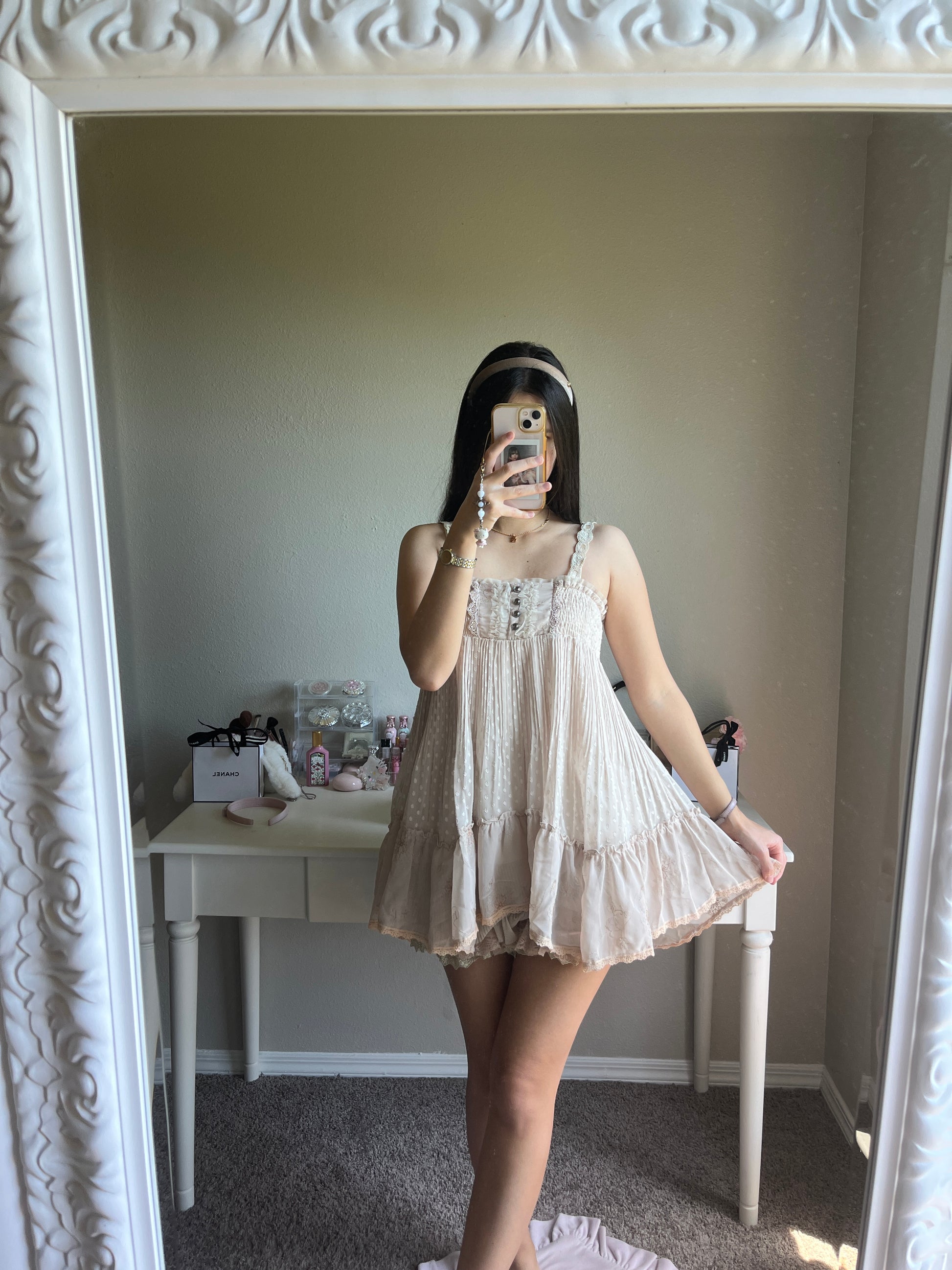 ♡ cute gray/tan two way mini dress with removable straps so you can wear as a skirt, and shirring bust. cute layered lacey style