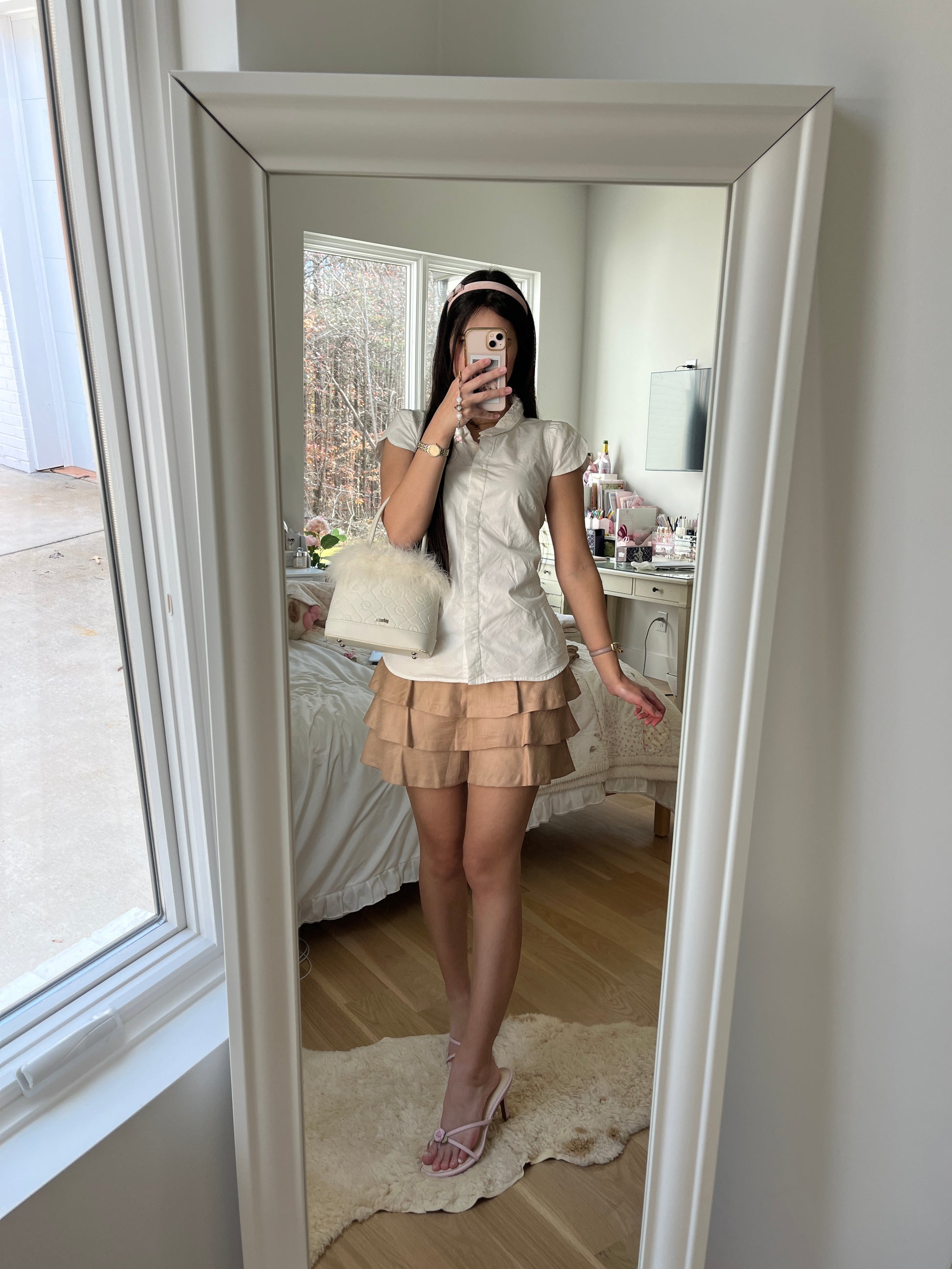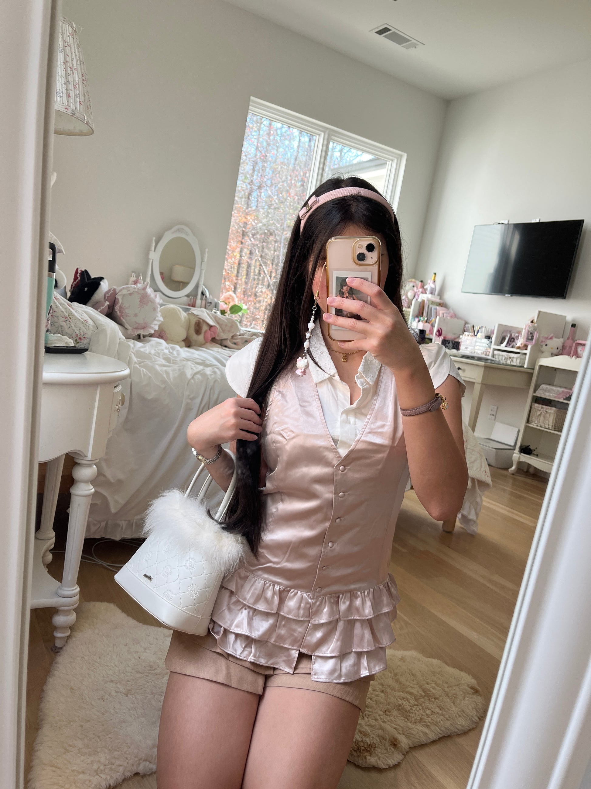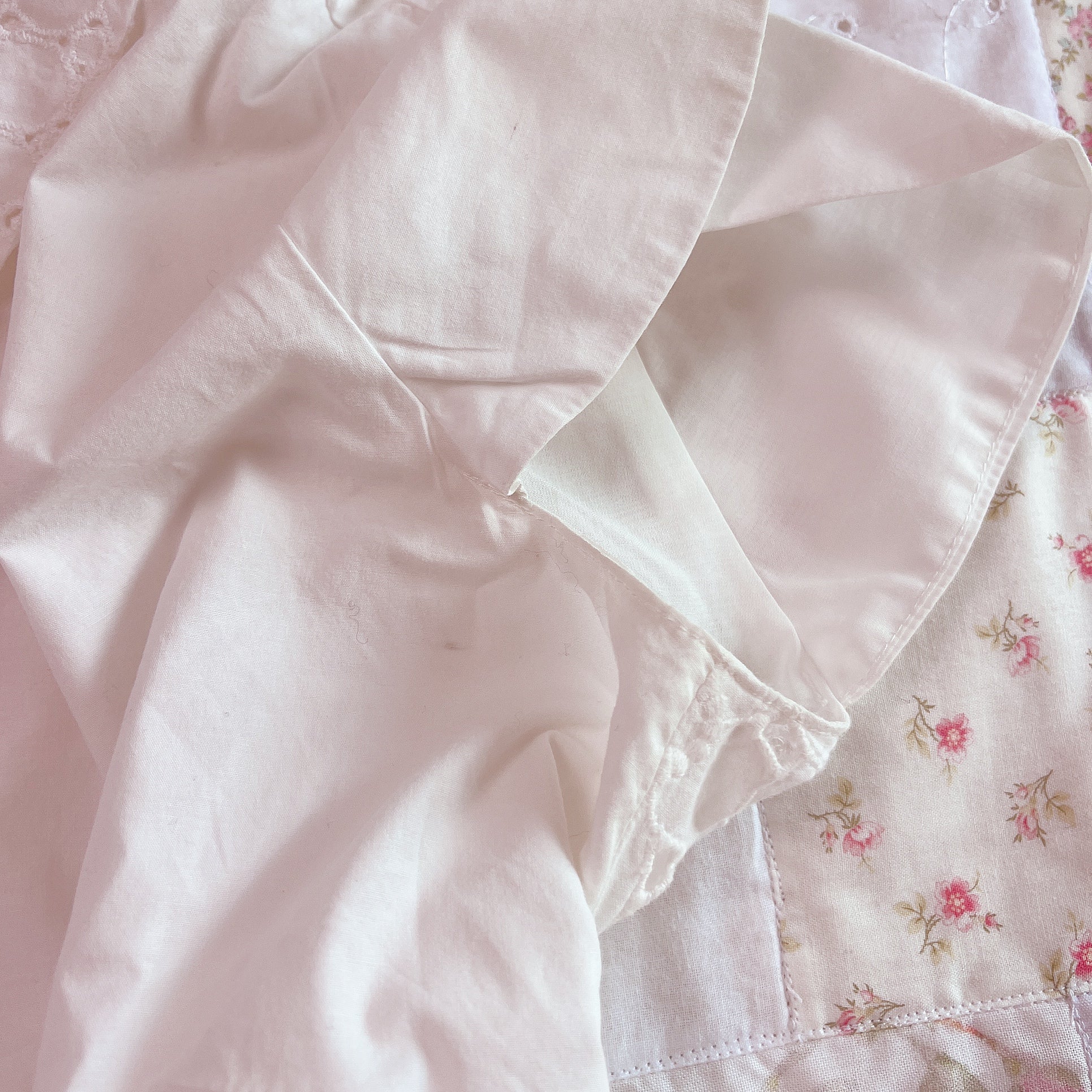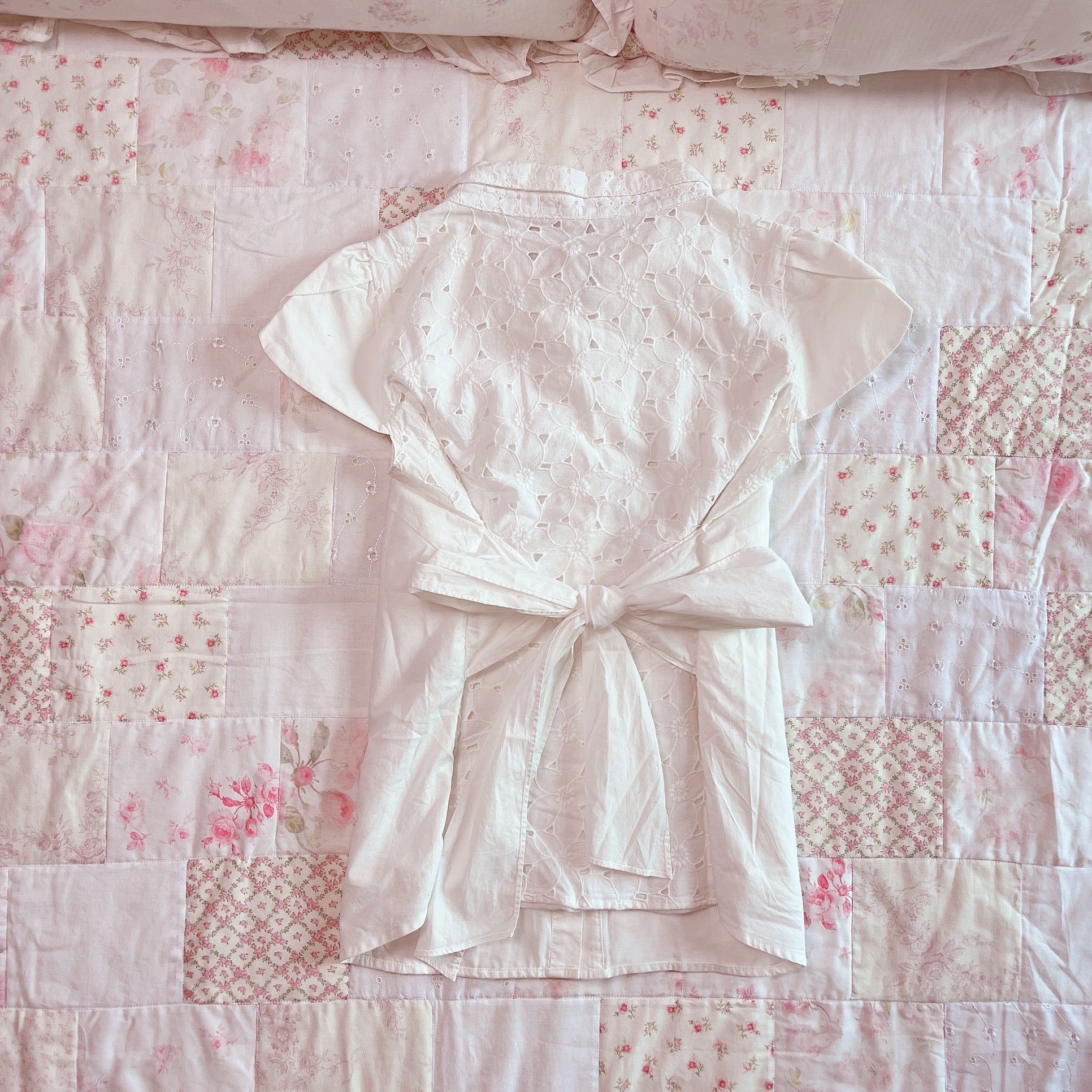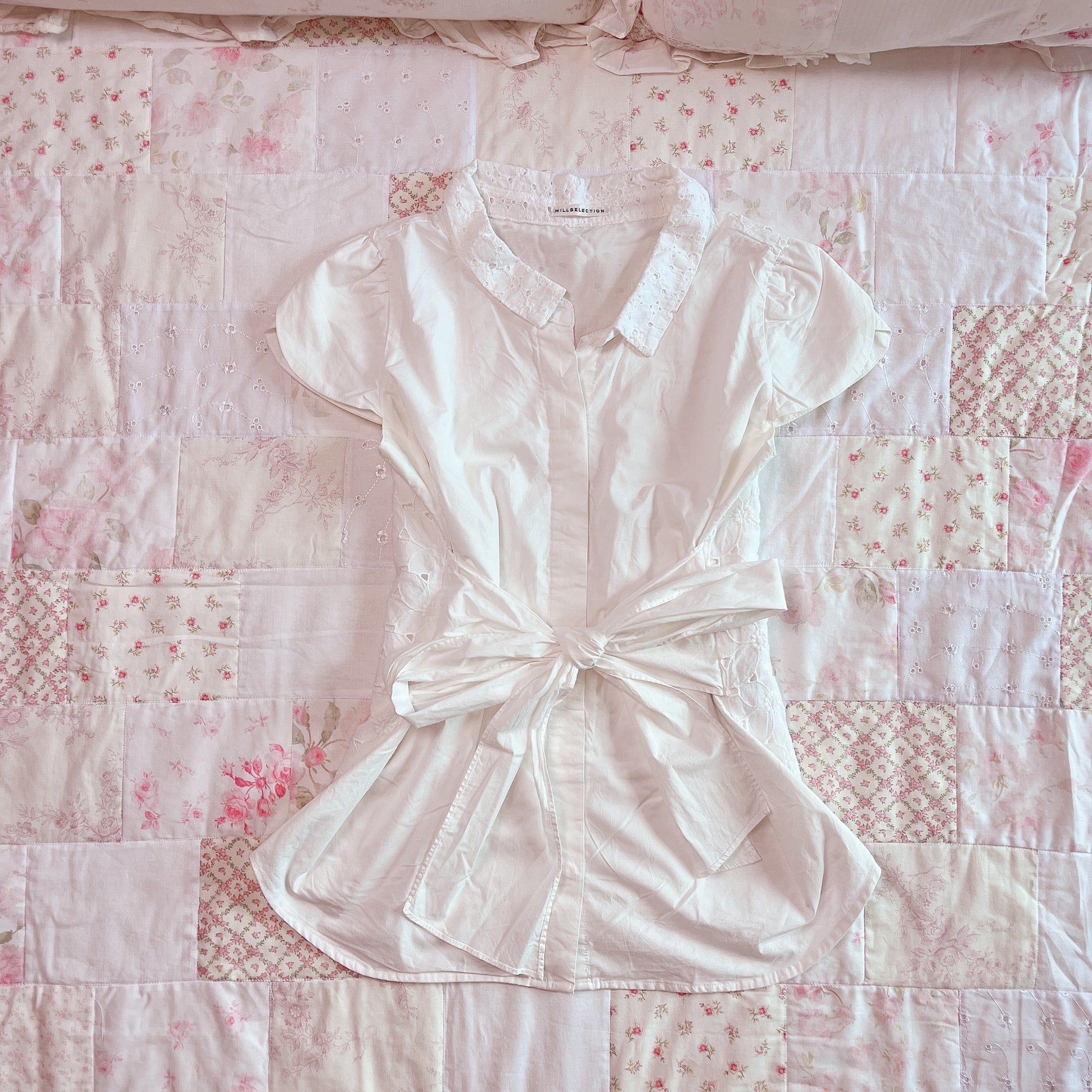 ♡ simple and feminine white button down shirt featuring a back waist-tie, covered buttons, cute geometric cap sleeves, and a venetian lace back. perfect for my shoujo girls that have school dress codes, also great for layering. slightly longer length makes it pair perfectly over miniskirts